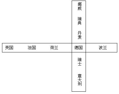 2.利用欧洲西部人口分布图分析人口分布的特征,在此基础上借助十字分布带掌握欧洲西部人口稠密区的分布规律:欧洲西部人口稠密区就沿着煤矿和工业地带分布,略呈“十”字形,其中中欧的德国为“十”字的中心。