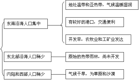 内陆、西部为热带沙漠→人口稀少,只有少数采矿点。