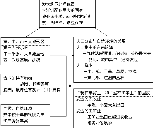 本节教材归纳为五个标题进行表述,抓住了澳大利亚地理的主要特征。其知识结构可用下图来表示: