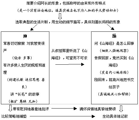作者善于抓住富有特征性的细节,寥寥几笔,就勾勒出人物的个性。例如长妈妈夜间在床中间摆成一个“大”字,经旁人提醒以后,依然如故,“一条臂膊还搁在我的颈子上”,这似乎是涉笔成趣,其实表现了长妈妈的粗鲁和不拘小节。描写吃福橘,“‘恭喜恭喜!大家恭喜!真聪明!恭喜恭喜!’ 她于是十分欢喜似的,笑将起来,同时将一点冰冷的东西,塞到我的嘴里。”这元旦“辟头的磨难”寄托着长妈妈的愿望,她希望孩子和自己能够“一年到头,顺顺流流”,这其中更为重要的是孩子,因为福橘是塞在孩子的嘴里。这就是长妈妈对孩子真诚的关爱,生动地表现了她的朴实和善良。写她买来《山海经》时,“穿着新的蓝布衫回来了”,一见面,就将一包书递给“我”,高兴地说:“哥儿,有画儿的‘三哼经’,我给你买来了!”这里,不仅看到一个衣着朴素、满脸笑容的劳动妇女的外貌,而且听到他那亲切自然的语言,感受到她为孩子办成一件事后内心的无比喜悦。“三哼经”恰如其分地表现了她的身份和社会地位。这个细节也说明了,为“我”办这件事情的不是学问人,而是连书名都说错的劳动妇女,联系课文的标题可以体会到,作者把阿长同《山海经》连接在一起,表现了设题同构思的新颖和巧妙。