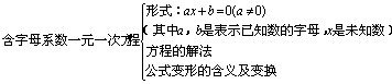 含字母系数的一元一次方程和公式变形是数学后继知识的基础,而且是中学其他学科的工具。含字母系数的一元一次方程是一元一次方程的一般形式,因此解法和数字系数的一元一次方程相同,注意两者之间的区别,其一,在系数化为1时,所乘以或除以的含有字母的式子不能为零,必须遵循方程的同解原理;其二,方程的解写成分式的形式时,一般要化为最简分式或整式。公式变形关键要理解为几个量之间的关系,其中一个为未知数,其余为已知数,用已知数表示未知数,只有要学生把握这一点,才理解公式变形的意义,可以结合具体实际问题讲解。
