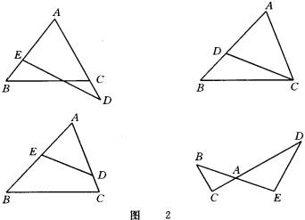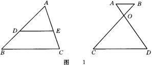 (4)三角形相似的基本图形:①平行型:如图1,“A”型即公共角对的边平行,“×”型即对顶角对的边平行,都可推出两个三角形相似;②相交线型:如图2,公共角对的边不平行,即相交或延长线相交或对顶角所对边延长相交.图中几种情况只要配上一对角相等,或夹公共角(或对顶角)的两边成比例,就可以判定两个三角形相似。