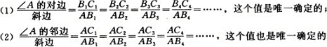 这就是说,每当一个锐角确定了,包含这个角的直角三角形的上述2种比值也就唯一确定了,它们有确定不变的对应关系.为了简单地表达这些对应关系,我们引入了正(余)弦的说法,创造了sin 和cos这样的符号.