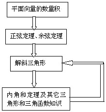 运用平面向量的数量积推导出三角形的正弦定理和余弦定理,连同三角形、三角函数的其它知识作为工具,比较系统地研究了斜三角形求解这个课题.知识结构可用框图表示如下: