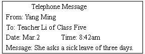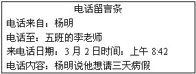 书写电话记录卡是我们日常生活、办公、学习中常常碰到的事。接个电话,要找的人不在,需要对方留言,我们要学会怎样写这种“电话留条”。下面我们看一个例子: