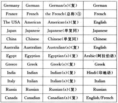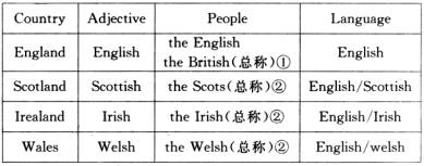 ②the Scots=people of Scotland,表示全体苏格兰人。就个体而言,男性用Scotsman(复数Scotsmen), 女性用Scotswoman (复数Scotswomen )。the Irish, the Welsh情况同此。