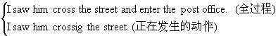 前者表示“看见某人做了某事”,后者表示“看见某人正在做某事”。比较: