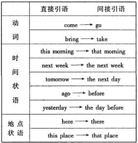 1)普通陈述句由直接引语变间接引语时需注意人称代词的变化、时态的变化以及某些动词和时间、地点状语的变化。人称代词的变化需根据具体的语境而定。动词时态的变化一般向前推进一个时态,如现在时要改为过去时、过去时改为过去完成时等。某些动词、时间和地点状语的变化可参见下表。