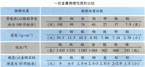 (菜刀、锤子都应是由硬度大的物质做成,从表中可见,铁的硬度远远大于铝,所以,铁用有以上用途是因其硬度较大。学生也可能进一步提出问题:为什么不用铬呢?这里要讲解,在考虑物质的用途时,性质不是唯一决定因素,还需考虑价格、资源、美观、使用是否便利及是否易于回收和对环境的影响等多种因素。)
