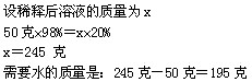 答:把50克质量分数为98%稀释成质量分数为20%的溶液,需要水195克