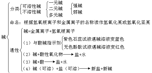 6.通过复习氢氧化钠,氢氧化钙的化学性质引出碱的通性并根据熟悉的碱引出碱的分类和命名。