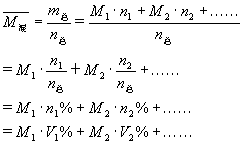 [分析] 已知混合气体的组成,求其相对分子质量,应先求出混合气体的平均摩尔质量。如用n1、n2……表示混合物中各组分的物质的量;M1、M2……表示混合物中各组分的摩尔质量;V1、V2……表示混合物中各组分的体积,则混合气体的平均摩尔质量可由下面的公式求得: