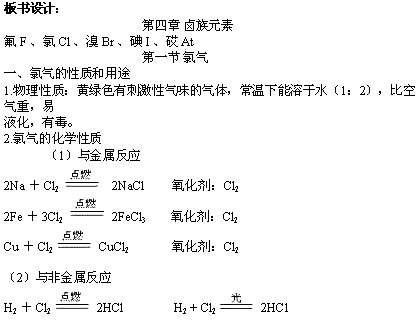 2.掌握氯气的化学性质,以氯原子的结构特点作为切入点,通过氯气与多种物质的反应来认识氯气是一种化学性质很活泼的非金属单质,具有强氧化性。