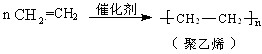 [指出] 乙烯的这种加成反应形成了相对分子质量很大的物质,我们把这种相对分子质量很大的物质叫作高分子化合物,而像乙烯这样由相对分子质量小的化合物分子互相结合成相对分子质量很大的高分子化合物的反应就叫做聚合反应,乙烯的聚合实质上也是一种加成,因此这种反应也叫做加成聚合反应,简称加聚反应。