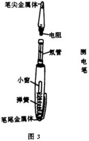 测电笔的构造如图3所示:由金属笔尖、大电阻、氖管和笔尾金属体依次相连而成.在使用测电笔时,用手捏住笔尾金属体,将笔尖接触进户线,若碰到的是火线,则氖管发光.这是因为火线与人所站的大地之间存在电压,而大电阻和氖管的电阻比人体电阻大很多,所以大部分电压加在了大电阻和氖管上,使氖管发光.若笔尖接触的是零线,氖管就不会发光.