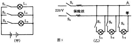 1.三盏灯在图9甲、乙两电路中,连接方法是否相同?