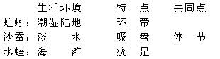 通过学习,组织学生总结蚯蚓、水蛭和沙蚕的异同: