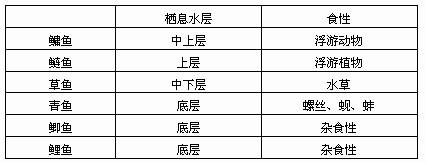 (2)在学生初步认识了这六种淡水鱼后,给学生展示这六种淡水鱼生活在池塘中的生活环境的图片,提出以下几道思考题供讨论:①对照图指出这六种淡水鱼的名称是什么?②这些淡水鱼的体形体色如何?③他们栖息的水层及食性如何?第一、第二题学生对照图,能比较容易答出来,在第三题学生回答后,要求完成下列表格。