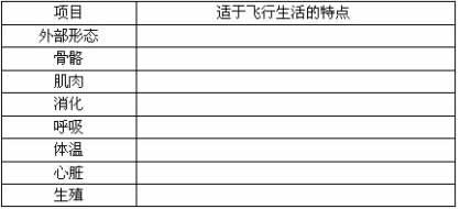 1.从下表几方面归纳总结鸟类适于飞行生活的形态结构特点和生理特点(师生共同完成下表:)