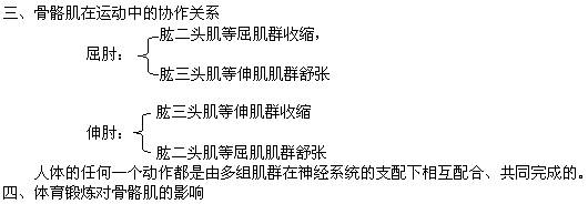 这时,教师出示骨骼肌协作关系挂图或模型,说明肱二头肌结构和附着点,并进一步引申:任何一个准确的动作都是由多块肌肉组成的肌群共同协作下完成的。