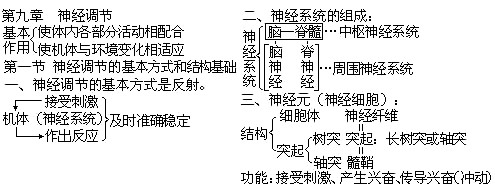 神经调节的作用→反射的概念→神经系统的组成→神经元的结构与功能。
