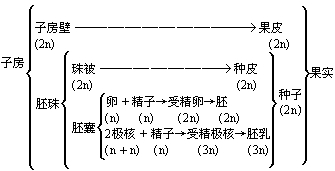 被子植物进行受精时,花粉管中的两个精子分别与卵细胞和2个极核结合,形成受精卵(2n)和受精的极核(3n)。受精卵是植物个体发育的起点;受精卵将发育成胚,受精极核发育成胚乳,珠被发育成种皮,整个胚珠发育成种子。