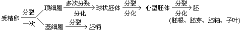 指出,胚的发育进行的是有丝分裂;球状胚体细胞继续分裂,细胞数目增多,同时形态和机能发生分化,形成胚根、胚芽、胚轴、子叶,这四部分组成胚。