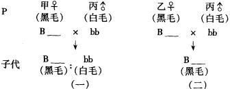 先根据题意列出遗传图式,但必须首先判断豚鼠毛色的显隐关系。题中的两种交配类型中,黑毛亲鼠已与白毛亲鼠雨交配,只产生黑毛鼠,故黑色一定是显性,白色一定是隐性。为此遗传图式是: