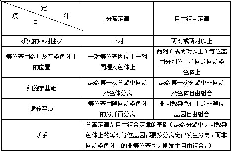 那么,孟德尔所总结的二个定律有哪些区别和联系呢?(请学生自己列表比较,在综合几位同学回答的基础上,得出下表)。