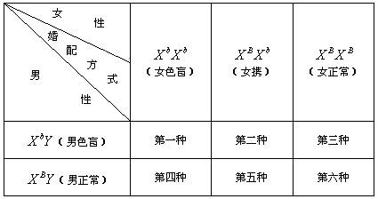 问:人的正常色觉和红绿色盲有哪些基因型和表现型?哪6种婚配方式:(填下表)