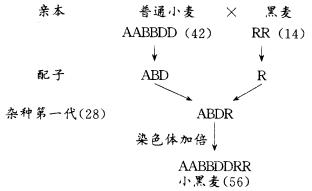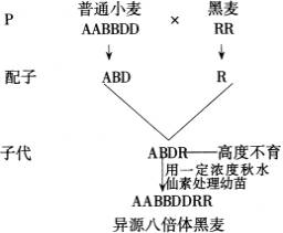 教师指着图解说明:普通小麦是异源六倍体(AABBDD),其雌配子中有三个染色体组(ABD),共21个染色体;以黑麦(RR)作父本,雄配子中有一个染色体组(R),7个染色体。杂交后子代含四个染色体组(ABDR),由于是异源的,联会紊乱,是高度不育的。若用一定浓度的秋水仙素处理子代幼苗即可加倍为异源八倍体(AABBDDRR),就能形成正常的雌雄配子,且都能受精、结实、繁殖后代,如图。(见下页。)