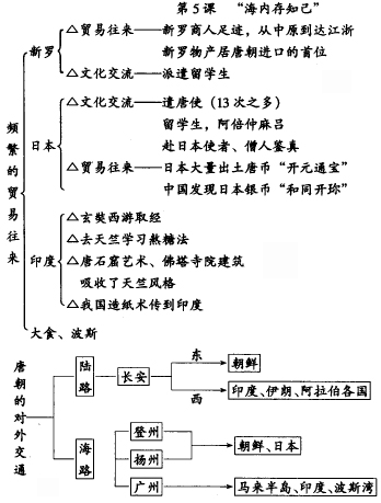 唐朝时,我国东边近邻日本正经历着激烈的社会变革,热切渴望输入先进文化摆脱落后。西边阿拉伯帝国刚刚崛起并迅速强大,与唐朝并立亚洲东西两端,形成亚洲两大经济文化交流中心。唐政府鼓励各国商人到中国贸易,四方客商、友好使者踏着漫漫丝绸之路,劈开万倾海浪,荟萃于物华天宝的中华大地,又带着盛唐文化的精髓,丰厚的物产,涌向亚洲各地。(让学生观察教材上的地图,指示唐朝陆路、海路交通线,说明同唐朝通商往来的有70多个国家,点明本课涉及的国家方位。)