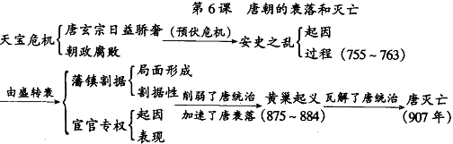 教师小结:唐朝中期以后,由于统治阶级的腐朽,政治腐败,各种矛盾尖锐起来,以安史之乱为转折点,唐朝从前期的盛世走向后期的衰落。再加上地方上的藩镇割据和中央政府内部的宦官专权,严重削弱了唐朝的统治力量,加速了唐朝的衰落。经过一场大规模的农民战争,唐朝瓦解了。