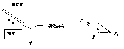 实验过程:将橡皮筋套在中指上,将铅笔与橡皮筋连接,铅笔尖端卡在手心处,体会一下铅笔的重力产生的效果,在铅笔上挂接上橡皮,思考拉力