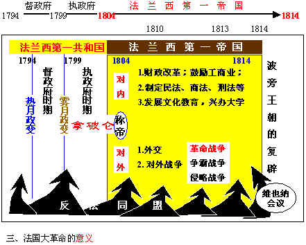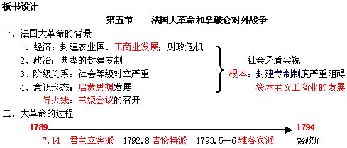 重点:法国大革命的背景;巴黎人民的第三次武装起义;君主立宪派、吉伦特派、雅各宾派当权时的革命措施;法国大革命的意义;拿破仑巩固资产阶级革命成国的措施和对外战争的评价。
