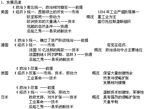 2、教师引导:这些现象的出现,一方面与现代社会发展的诸多因素有关,但另一方面它又与这些国家历史发展因素密切相关,从而构成了区别这些国家的特征。而在这些历史因素中,19世纪末20世纪初,是一个不容忽视的时期。这主要是这一时期,由于各国的国情不同,所以,第二次工业革命对各国的影响也就不同,表现出各自的经济、政治特征(而这一变化又与生产力与生产关系、经济基础与上层建筑的相互作用密不可分)。