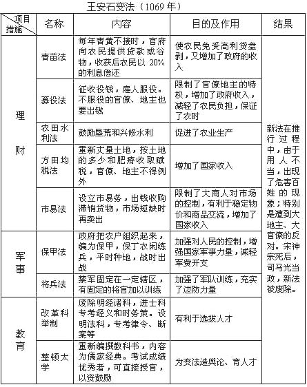 首先,要了解王安石变法的背景是北宋面临内忧外患的严峻形势,明确变法的目的是为了实现富国强兵,巩固统治。然后,指导学生逐项完成下面表格的填充。(可通过幻灯片或计算机显示)主要强调表格中“目的及作用”这一项。