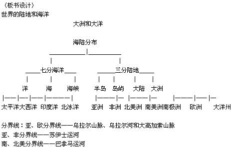 〈设计思想〉根据本节教材对知识、能力、情感态度价值观念三个方面的要求,本节课设计了三个主要教学环节:第一个环节,在第一章地球知识和地二章地图知识的基础上,本章教材的特点是配备大量的图,海陆分布的状况以及七大洲、四大洋的位置和轮廓,都是通过读图获得的。如何使学生在图中能直接概括描述、分析比较、进而独立说明,摆脱背诵定义文字的记忆概念的学法。是本节重要的任务。要读图较多,难度并不大,教师要特别注意,提问要具体、明确,避免重复、罗嗦。把能由学生完成的尽量让他们来做,变成学生活动。