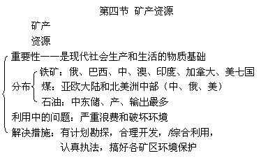 矿产资源是学习的几种自然资源中唯一的不可再生资源。所以本节紧紧围绕不可再生资源尤其是主要的能源石油、煤炭和主要的资源铁矿的利用及利用中存在问题展开讨论和学习。为了使同学了解矿产资源的重要性,必须引导学生从生活实际中找出与矿产资源的关系,增加感性知识是必需的。
