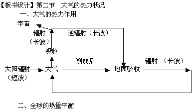 【教学手段】录像片《大气对太阳辐射的削弱和保温作用》,《温室效应的产生》;Powerpoint课件