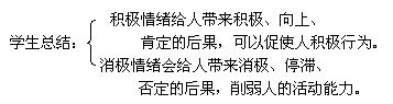 师生共同结论:情绪对人的身体、智力、发挥水平、性格等方面有影响。身体:积极情绪----治病,消极情绪----导致疾病。智力:积极情绪---使人易控制理智、增强记忆,消极情绪----使判断力、分析力下降、记忆力减退。