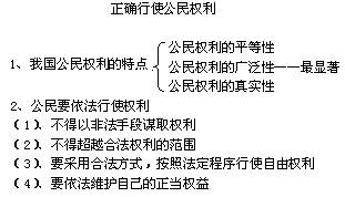 [小结]:我们了解公民权利的特点:平等性、广泛性、真实性,这些是社会主义制度的优越性的体现,同时在行使自己的权利和自由时,必须依法进行,不得损害国家、社会、集体利益和其他公民合法的自由权利,不得滥用权利,并勇于同滥用权利的行为作斗争。
