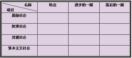 通过填写,让学生重温过去的知识。知道在原始社会里,不存在阶级、阶级剥削和压迫。人类文明的第一粒火种在这里点燃。但原始人过着茹毛饮血的生活,甚至出现过人吃人的现象,处在蒙昧和野蛮状态之中。因此,生产力水平极端低下、生存条件极其艰难的原始社会是人类社会最初的也是最低级的发展阶段。漫长的原始社会之后,人类进入第一个阶级社会:奴隶社会。奴隶社会、封建社会、资本主义社会这三个存在剥削压迫的阶级社会都创造出了比前一个社会更高的生产力,因而有历史进步性。但同时我们从录像里可以看到下层的劳动人民在这样的社会里受尽了剥削和压迫。只有共产主义社会才是没有剥削、没有压迫的理想社会。因为在共产主义社会里,生产力高度发达;实行各尽所能、按需分配;劳动成为人的第一需要;剥削、压迫等罪恶现象不复存在;人们具有高尚的道德觉悟,团结互助……(教师可以在此让学生结合当地或自家的实际情况,说明作为共产主义低级阶段的社会主义社会有何优越性,但要真正达到理想社会的水平,尚需努力。)