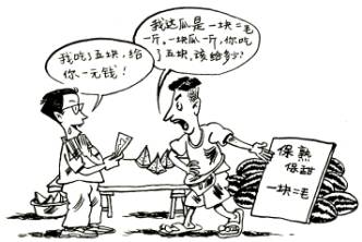 (在学生回答的基础上)教师引导:在人们的传统观念中,对商人是没有好印象的,究其原因就是因为商人过于狡诈,一切以贏利为目的,根本谈不上更多的可信任度。从西方莎士比亚的戏剧《威尼斯商人》到中国的俗话“无商不奸”都充分说明了这一点。这幅漫画更是充分证实了这一点,连街头的小贩都知道用文字游戏欺骗顾客,这是令人寒心之至。这个商贩既违背了公平原则,有违背了诚实信用原则。