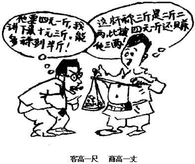 提问:这三幅漫画和郑板桥的诗是在讽刺什么社会现象?图中的伙计违背了什么市场交易原则?