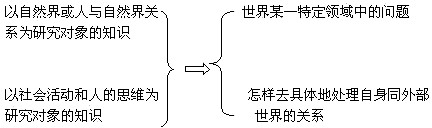 教师归纳:哲学不同于具体科学知识。具体科学研究的都是世界某一特定领域、某一局部的问题,揭示的是自然界或社会现象的特殊本质和规律。哲学是把整个世界作为研究对象,揭示的是世界万事万物的共同本质和普遍规律。