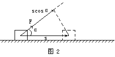 再根据公式W=Fs做启发式提问:按此公式考虑,只要F与s在同一直线上,乘起来就可以求得力对物体所做的功。在图2中,我们是将位移分解到F的方向上,如果我们将力F分解到物体位移s的方向上,看看能得到什么结果?至此在图2中将F分解到s的方向上得到这个分力为Fcosα,再与s相乘,结果仍然是W=Fscosα。就此指出,计算一个力对物体所做的功的大小,与力F的大小、物体位移s的大小及F和s二者方向之间的夹角α有关,且此计算公式有普遍意义(对计算机械功而言)。至此有如下板书: