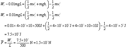 kg的汽车开上一山坡。汽车沿山坡每前进100m,其高度升高2m。上坡时汽车速度为5m/s,沿山坡行驶500m后速度变为10m/s。已知车行驶中所受阻力大小是车重的0.01倍,试求:(1)此过程中汽车所受牵引力做功多少?(2)汽车所受平均牵引力多大?取