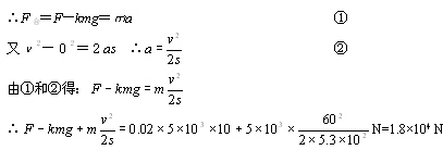 一架喷气式飞机,质量m=5×103 kg,起飞过程中从静止开始滑跑的路程为s=5.3×102m时,达到起飞速度v=60m/s,在此过程中飞机受到的平均阻力是飞机重量的0.02倍(k=0.02),求飞机受到的牵引力.