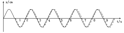 如图所示,实线是学生画的一种简谐运动的图象,虚线是振动沙摆中的砂流在木板上的痕迹形成的振动图象。试比较理论上画的图象和实际的振动图象有何不同?